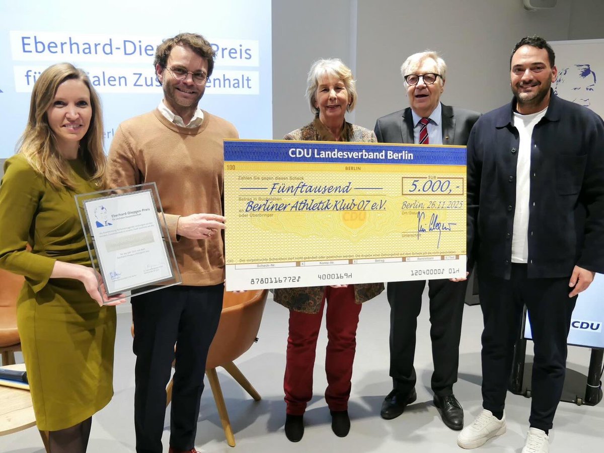 Berlin hat gestern wieder gezeigt, wie viel Kraft in freiwilligem Engagement steckt. 🤝❤️Bei der Verleihung des Eberhard-Diepgen-Preises standen Menschen und Projekte im Mittelpunkt, die unsere Stadt mit ihrem Einsatz spürbar stärken. Der diesjährige Preis geht an den @berlinerak1907 , den engagierten Fußballverein Berliner Athletik Klub 1907 e.V., der sich gemeinsam mit Makkabi Deutschland im Projekt "move2respect" für ein respektvolles Miteinander einsetzt. Das Programm richtet sich an jüdische und muslimische Aktive in Berliner Sportvereinen und befähigt sie in Workshops, einen wertschätzenden Umgang, Vielfalt und Gemeinschaft in ihren Vereinen zu entwickeln und umzusetzen. ⚽✨Der Ehrenpreis zeichnet die Arbeit von @huerdenspringer_mentoring aus: einem Mentoring-Projekt, das seit vielen Jahren Kindern und Jugendlichen neue Chancen eröffnet und wichtige Brücken zwischen unterschiedlichen Lebenswelten baut. Jede Begegnung schafft Perspektiven. 🙌Unser herzlicher Dank gilt allen Preisträgern. Mit dem Eberhard-Diepgen-Preis würdigen wir Initiativen, die Berlin solidarischer, wärmer und menschlicher machen.