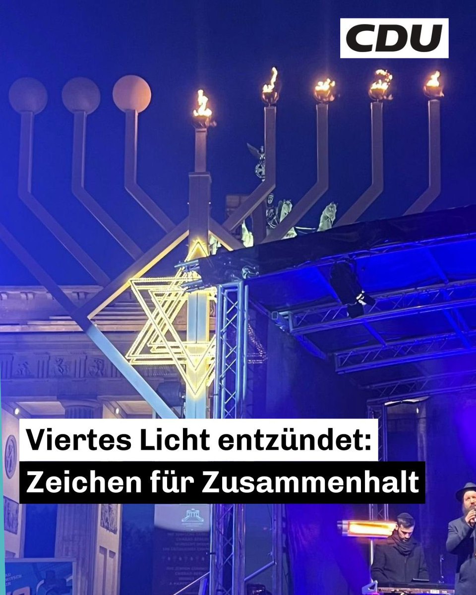 mehrChanukka am Brandenburger Tor 🕎 Heute fand die zentrale Feier des jüdischen Lichterfestes am Brandenburger Tor statt. Bevor die vierte Kerze 🕯️ am größten Chanukka-Leuchter Europas entzündet wurde, sprachen u. a. unser Regierender Bürgermeister @kaiwegner.cdu, @juliakloeckner und der Vorsitzende der Jüdischen Gemeinde zu Berlin, @rabbiteichtal. Gerade in Zeiten von Dunkelheit, Unglück und Terror ist es umso wichtiger, Licht in die Welt zu bringen. Mit dem Entzünden der vierten Kerze wurde ein starkes Zeichen für Hoffnung, Zusammenhalt und Menschlichkeit gesetzt. Wir danken auch der @polizeiberlin, die mit großem Einsatz rund um die Uhr für Sicherheit sorgt und solche Veranstaltungen möglich macht. 🙏🏻 #DeinBerlin #CDUBerlin #Chanukka #NieWiederIstJetzt #Zusammenhalt #LichtGegenDunkelheit