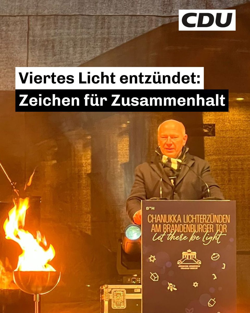 Chanukka am Brandenburger Tor 🕎Heute fand die zentrale Feier des jüdischen Lichterfestes am Brandenburger Tor statt. Bevor die vierte Kerze 🕯️ am größten Chanukka-Leuchter Europas entzündet wurde, sprachen u. a. unser Regierender Bürgermeister @kaiwegner.cdu, @juliakloeckner und der Vorsitzende der Jüdischen Gemeinde zu Berlin, @rabbiteichtal.Gerade in Zeiten von Dunkelheit, Unglück und Terror ist es umso wichtiger, Licht in die Welt zu bringen. Mit dem Entzünden der vierten Kerze wurde ein starkes Zeichen für Hoffnung, Zusammenhalt und Menschlichkeit gesetzt.Wir danken auch der @polizeiberlin, die mit großem Einsatz rund um die Uhr für Sicherheit sorgt und solche Veranstaltungen möglich macht. 🙏🏻#DeinBerlin #CDUBerlin #Chanukka #NieWiederIstJetzt #Zusammenhalt #LichtGegenDunkelheit