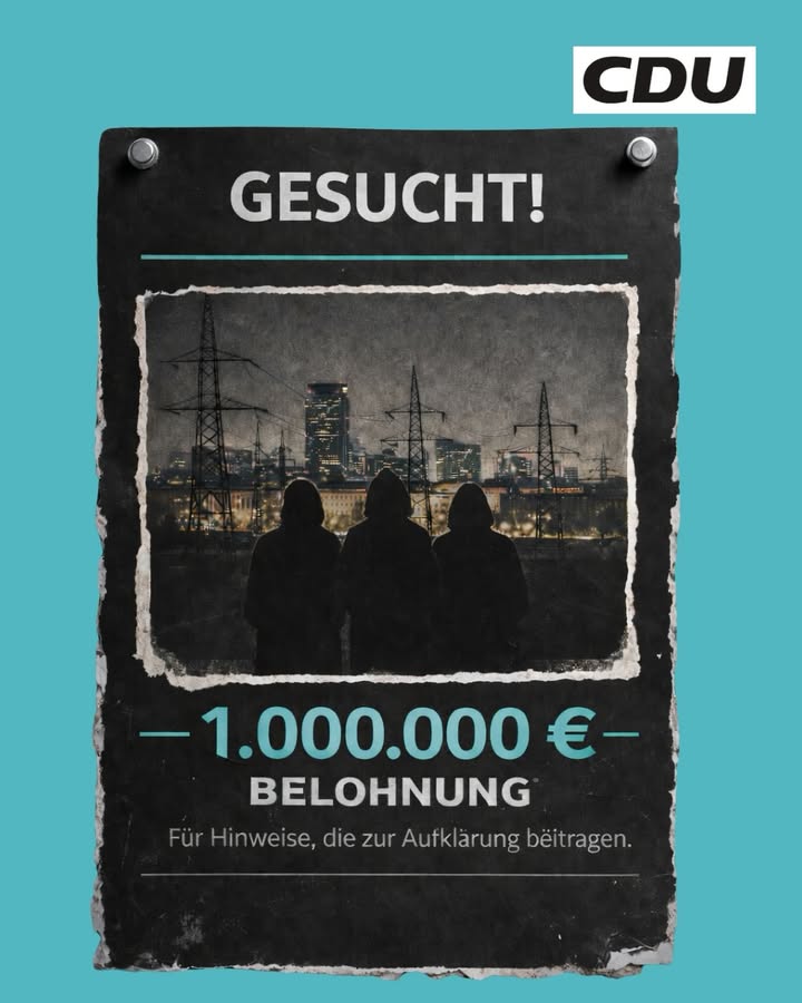 mehr1 MILLION EURO BELOHNUNGDer linksextreme Terrorakt auf die Berliner Stromversorgung war ein schweres Verbrechen und ein Angriff auf die Menschen in unserer Stadt.Um die Täter zu ermitteln, setzt das Bundeskriminalamt eine Belohnung von 1 Million Euro für sachdienliche Hinweise aus.Der Schutz kritischer Infrastruktur ist Kernaufgabe des Staates. Wer Kraftwerke, Netze oder Versorgungseinrichtungen sabotiert, gefährdet bewusst Menschen, Unternehmen und das Vertrauen in unseren Rechtsstaat.👉 Hinweise können vertraulich beim Bundeskriminalamt oder bei jeder Polizeidienststelle abgegeben werden (Link im Kommentar).#CDUBerlin #DeinBerlin #CDUtutBerlingut #Sicherheit